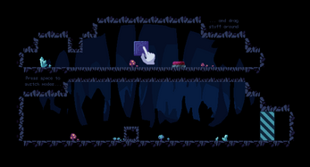 I wanted to implement a core mechanic that made the game interesting, and came with a switch between two modes: a player mode, and a god mode. In player mode, you can walk and dash around, and interact with buttons, levers, and moveable blocks. In god mode, player movement is restricted, gravity is disabled, and you can drag moveable blocks around with your cursor. In god mode, you can access places you normally can't while in player mode.